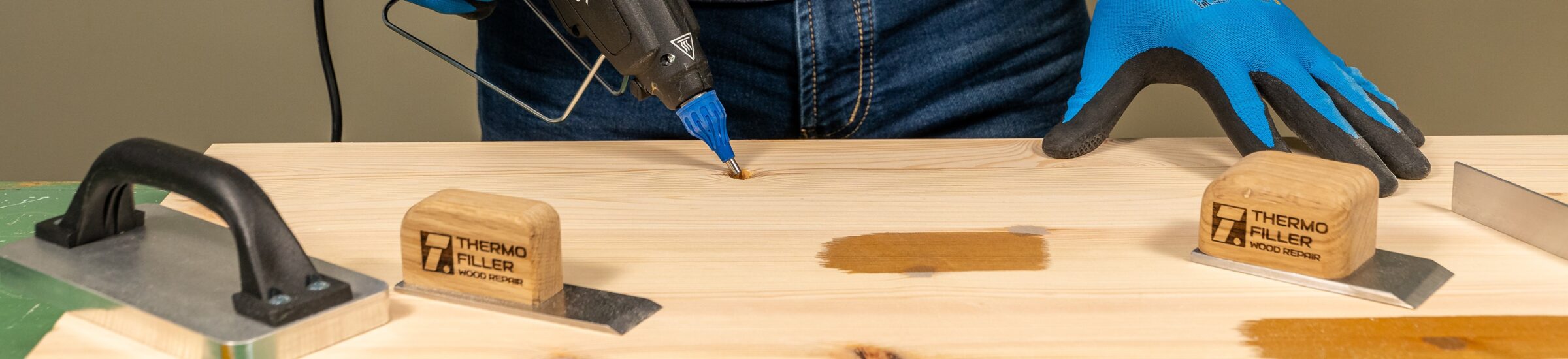 Thermo Filler is natural, environmentally friendly and non-toxic wood filler specifically developed for quick and convenient repairs of defects in wood. In only 10-120 seconds it makes possible to mend knotholes, resin pockets and cracks. Because of its elasticity and waterproofness, Thermo Filler is suitable for both indoor and outdoor use. It enables to repair bigger defects with one filling, as it does not crack or shrink while ‘drying’. Instantly ready for finishing jobs: sanding, painting, staining, varnishing, oiling.